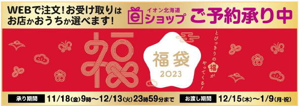イオン北海道(株)(札幌市白石区、青栁英樹社長)は 11月18日(金)~12月13日(火)の期間、イオン北海道のインターネットショップ「eショップ」において、衣料品の「福袋2023」の予約を受け付ける。