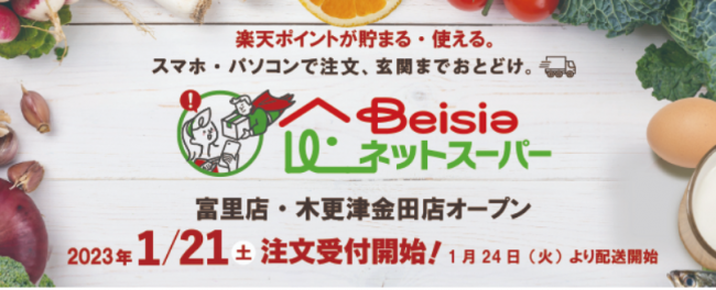 (株)ベイシア(群馬県前橋市、相木孝仁社長)は、楽天グループ(株)が提供するネットスーパーのプラットフォーム「楽天全国スーパー」内に出店している「ベイシアネットスーパー」において、1月24日(火)から千葉県の富里店・木更津金田店からの配送を開始する。これにより、富里市・成田市・袖ケ浦市では世帯数の約半数をカバーする。注文受付は1月21日(土)からで、配送開始は1月24日(火)から。