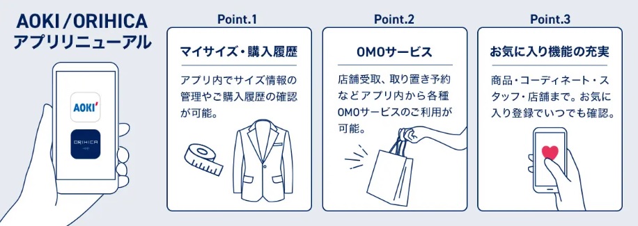 (株)AOKI(神奈川県横浜市、森裕隆社長)はAOKI公式アプリ・ORIHICA公式アプリをリニューアルする。このリニューアルによって、各種ウェブサービスをシームレスに提供するための基盤づくりを行い、顧客の要望に合わせた購買体験の提供を目指す。