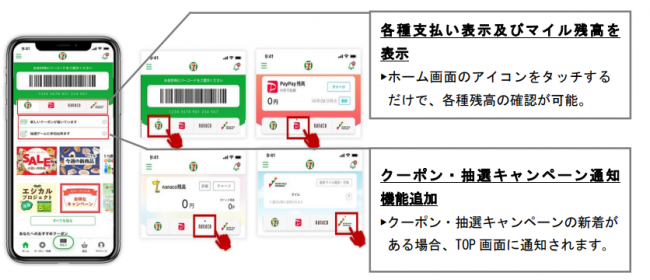 今回のリニューアルでは、AI技術等も活用し、一人ひとりの利用や購入状況に合わせてクーポンを発行できるようにした。また、ホーム画面は、操作性を高めるために使用を変更した。各種支払い表示およびマイル残高表示のほか、クーポン・抽選キャンペーン通知機能といった、使用頻度の高い機能をホーム画面に配置した。