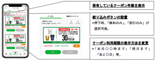 クーポン・特典画面では、保有枚数・利用期限を確認しやすいように表示方法を変更した。保有しているクーポン件数を表示し、絞り込みボタンを設置した。クーポン利用期限の表示方法も、「あと〇日」「明日まで」のように期限が分かるように変更した。