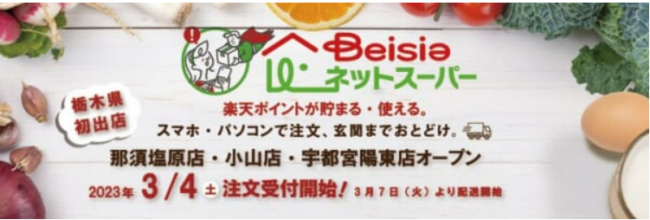 (株)ベイシア(群馬県前橋市、相木孝仁社長)は、楽天グループ(株)が提供するネットスーパーのプラットフォーム「楽天全国スーパー」内に出店している「ベイシアネットスーパー」において、3月7日(火)から栃木県の那須塩原店・小山店・宇都宮陽東店からの配送を開始する。これにより、小山市・大田原市では世帯人口の約60%をカバーする。注文受付は3月4日(土)からで、配送開始は3月7日(火)から。