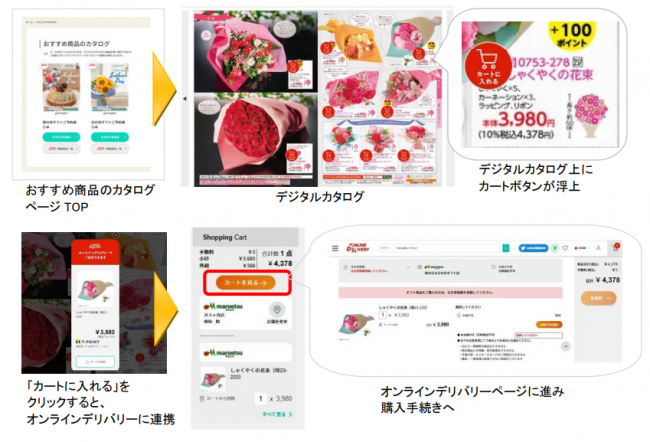 マルエツホームページの「おすすめ商品のカタログ」ページに掲載するデジタルカタログは、これまでの閲覧機能だけに留まらず、新たに単品ごとに(一部商品を除く)カートボタンを実装し、そこから直接、オンラインデリバリー(食品宅配サービス、インターネットショッピング)にリンクして商品が購入できるようになる。