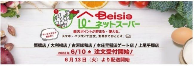 (株)ベイシア(群馬県前橋市、相木孝仁社長)は、楽天グループ(株)が提供するネットスーパーのプラットフォーム「楽天全国スーパー」内に出店している「ベイシアネットスーパー」において、6月13日(火)から、埼玉県の栗橋店・大利根店・本庄早稲田ゲート店・上尾平塚店、茨城県の古河総和店、計5店からの配送を開始する。