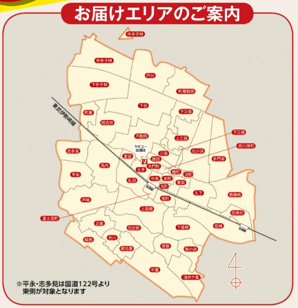 配送エリアは、加須市の上三俣、下三俣、三俣、北小浜、浜町、南町、下高柳、馬内、礼羽、下谷、富士見町、不動岡、中央、土手、愛宕、岡古井、諏訪、睦町、久下、東栄、元町、本町、向川岸町、大門町、上高柳、日出安、戸崎、花崎、花崎北、南篠崎、外川、正能、根古屋、騎西、常泉、南小浜、牛重、多門寺、油井ケ島、戸川、町屋新田、平永(国道122号より東側)、志多見(国道 122 号より東側)。羽生市の町屋、下手子林、中手子林。