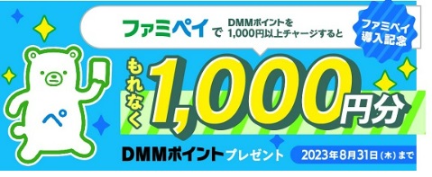 今回の「DMM. com」での、ファミペイオンライン決済開始を記念してキャンペーンも実施する。期間は、8月1日(火)から8月31日(木)まで。この期間中に、「DMM.com」のサイト内でDMMポイント1000円分以上をファミペイオンライン決済で購入した人に、1000円分のDMMポイントをプレゼントする。
