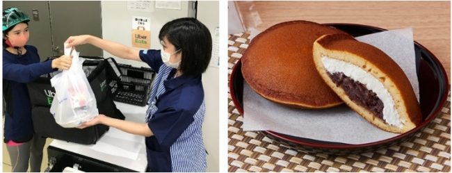左/ローソンでの「Uber Eats」イメージ、右/今回プレゼントする「どらもっち(あんこ&ホイップ)」
