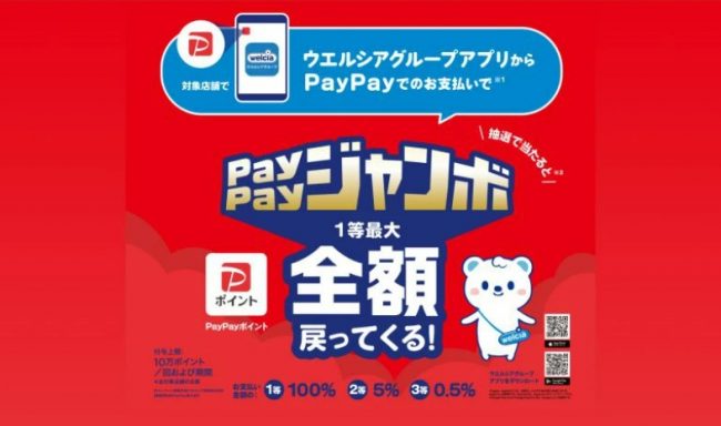 キャンペーン期間中に対象店舗で「ウエルシアグループアプリ」から「PayPay」で支払うと、1等当選者には最大で決済金額の全額(100%)のPayPayポイント(付与上限:10万ポイント/回および期間)が付与される。
