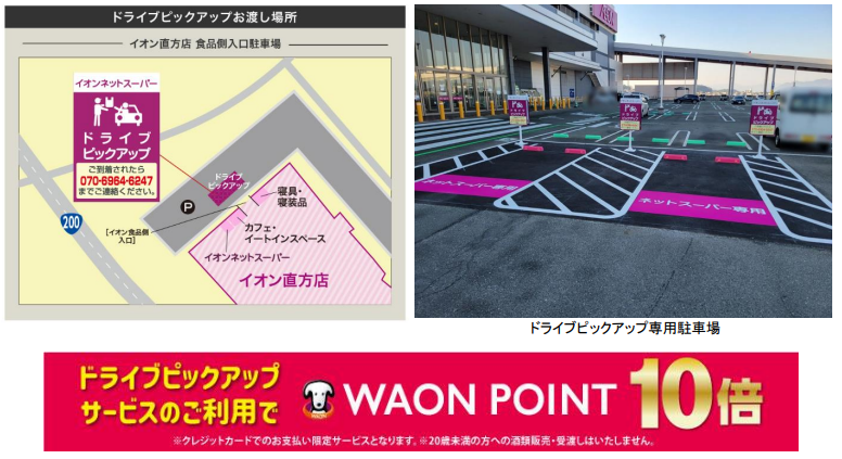 またドライブピックアップは、イオン直方店の専用駐車スペースで受け取りが可能。前日16:00までに注文すれば、翌日の11:00~15:00に受け取ることができる。また12:00まで受付で、注文当日の15:00~18:00の受け取りが可能となる。
