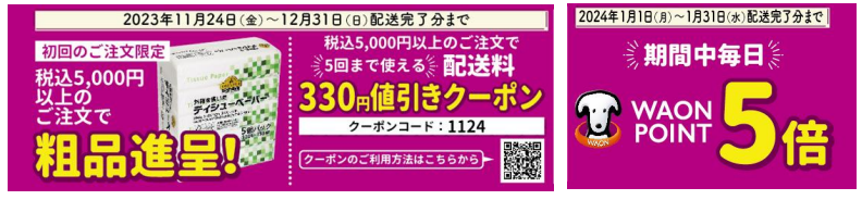 その他、サービス開始記念特典として、12月31日(日)配送完了分まで、初回かつ5000円以上の購入で、ティッシュペーパーなどの粗品を進呈する。また5000円以上の購入すると、5回まで使える配送料330円分の値引きクーポンがもらえる。2024年1月1日(日)から31日(水)の配送完了分までは、毎日WAON POINTが5倍になる。