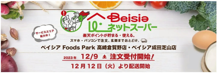 (株)ベイシア(群馬県前橋市、相木孝仁社長)は12月12日(火)から、11月22日にオープンした「ベイシア Foods Park 高崎倉賀野店」と「ベイシア成田芝山店」で「ベイシアネットスーパー」の配送サービスを開始する。