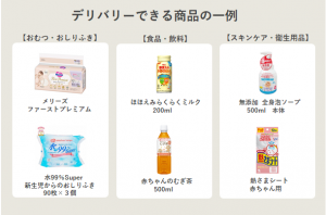 今回の「アカチャンホンポ」のデリバリーは、アカチャンホンポ「セブンタウン小豆沢店」1店舗だけでの開始となる。紙おむつや粉ミルクなど子育てに必要な商品をラインナップし、約1500商品を取り揃える。家事や育児、仕事のすきま時間に自宅などから簡単に商品を注文することが可能になる。