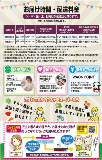 今回のサービス拡大は、離島のお客の利便性向上のため、座間味村の約360世帯(座間味島・阿嘉島)を対象に2月1日(木)から配送を開始する。前日16時までに注文した商品を、翌日イオン那覇店から配送。配送曜日は火・水・金・土・日の週5日。