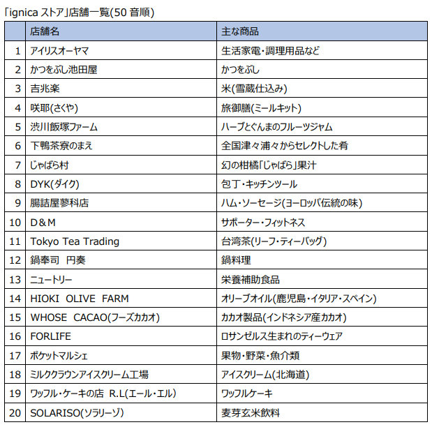 「ignicaストア」は出店している20店舗のほか、Online Delieryサービスとして「マルエツ」「カスミ」「マックスバリュ関東」のギフト販売や、U.S.M.HのPBとして展開するミールキットシリーズ「eatime chef」のオンライン販売も実施してる。