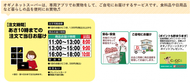 「オギノネットスーパー」は、店舗の食品売場で販売する商品を中心に専用のスマートフォンアプリから注文すると、近隣店舗から配送し、自宅など指定された住所へ商品を届ける配達サービス。注文商品は、配送当日に売場担当者が選定する。仕事や育児、介護や天候の悪い日など、店舗に立ち寄ることや買物時間がとれない顧客に対してサービスを提供する。