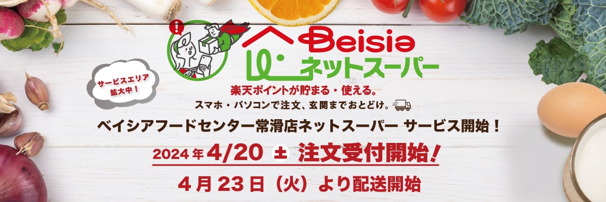 (株)ベイシア(群馬県前橋市、相木孝仁社長)は、楽天グループが提供するネットスーパーのプラットフォーム「楽天全国スーパー」内の「ベイシアネットスーパー」で、ベイシアフードセンター常滑店からの配送を4月23日(火)から開始する。