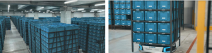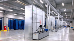 PopPick は、物流センター内において注文された商品を注文ごとに集品する「ピッキング作業」の工程に向けたギークプラス社のソリューション設備。在庫商品は、高さ約3.8メートル、縦に10段積んだ棚の折り畳みコンテナに高密度に保管されている。