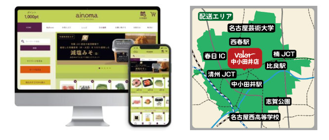 バローホールディングス傘下の(株)Vソリューションは、ネットスーパー「ainoma」を展開して、グループ会社の(株)バローで扱っている生鮮食品や惣菜、プライベートブランド商品など約1万点の商品(2024年5月29日時点)を配送している。入会金・年会費は不要で、ainoma会員への登録が必要となる。