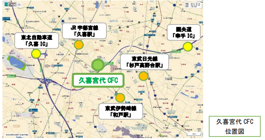 立地は、東北自動車道(久喜インターチェンジまで約5km)・首都圏中央連絡自動車道(幸手インターチェンジまで約8km)へアクセスが良く、東京都心部まで約60分(約50㎞)と交通利便性の高い場所に位置する。開業は2027年度予定。