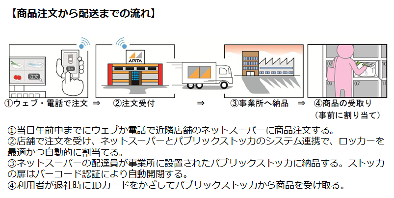 ユニーは17日、ネットスーパーで注文した商品をお客が勤務する事業所に設置した受取り用ロッカーに配送する実験を開始すると発表した。ユニーが運営する「アピタネットスーパー」で買物した商品を、終業後の退社時に受け取ってそのまま帰宅することを想定したサービスで、今後、自治体庁舎や保育園、病院、駅など公共性の高い場所へ設置することを視野に入れる。