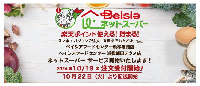 (株)ベイシア(群馬県前橋市、相木孝仁社長)は、楽天グループ(株)のプラットフォーム「楽天全国スーパー」内に出店する「ベイシアネットスーパー」で、ベイシアフードセンター浜松雄踏店・浜松都田テクノ店からの配送を10月22日(火)から開始する。