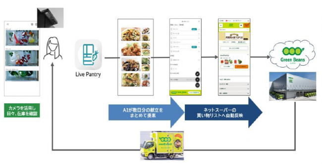 今回の共同実証実験では、一貫した食品の温度管理と使い切り提案を行うことで利用者の鮮度意識に対応しつつ、まとめ買いとその後の家庭での消費行動の変化を検証する。さらに、アプリで提案する献立と冷蔵庫の在庫食品との差分から、必要な食品をグリーンビーンズで購入できる仕組みを提供し、効率的で便利な買い物、消費体験の姿を検討していく。
