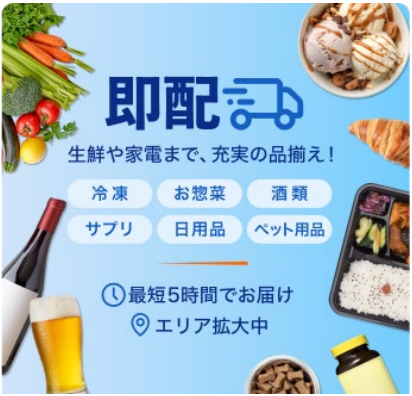 「即配」の対象商品は、生鮮食品、酒、冷蔵・冷凍食品から日用品、文具、ペット用品やインテリア(小型)、家電製品(小型)など。オンラインストア画面上で「即配ラベル」が表示されているものに限る。また品揃えは、出荷店舗のによって異なる場合がある。