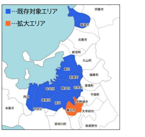これまで福岡市・糟屋郡を中心にサービスを提供してきたが、顧客要望に応えるため、9月に福津市を、そして今回春日市・大野城市の一部を対象エリアに追加。約95万世帯の人々が利用可能になった。