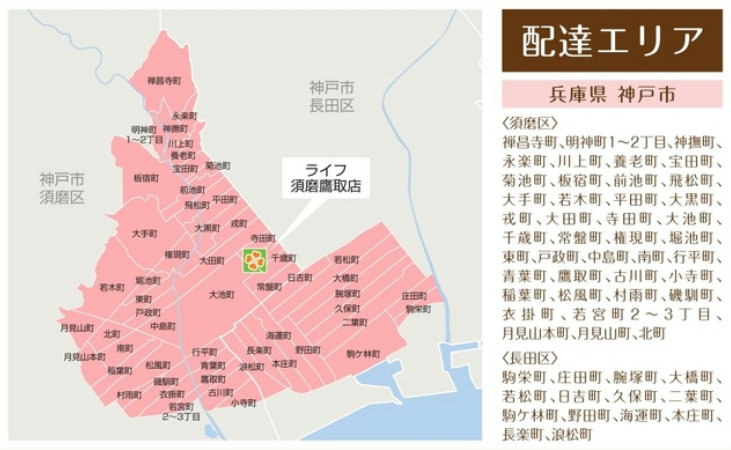 配送エリアは兵庫県神戸市須磨区・長田区の一部。