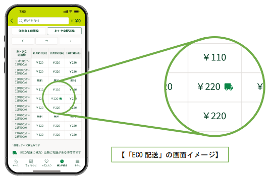 「ECO配送」は、最先端のAI技術を用いて最適な配送ルートを計算することで、効率的な燃料使用と二酸化炭素排出量削減を目指す取り組みだ。顧客は注文時に配送時間を選択する際、「ECO配送」枠を選択するだけで、環境への取り組みに参加していることになる。