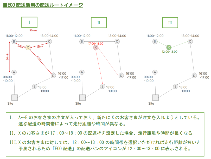 「ECO配送」では特定のエリアでの配送がグループ化されるため、デリバリークルー(配送員)が走行する距離や時間が間接的に短縮され、結果として二酸化炭素排出量の削減効果につながる。1ルートあたりの配送効率は、従来よりも1割程度向上できると見込んでいる。