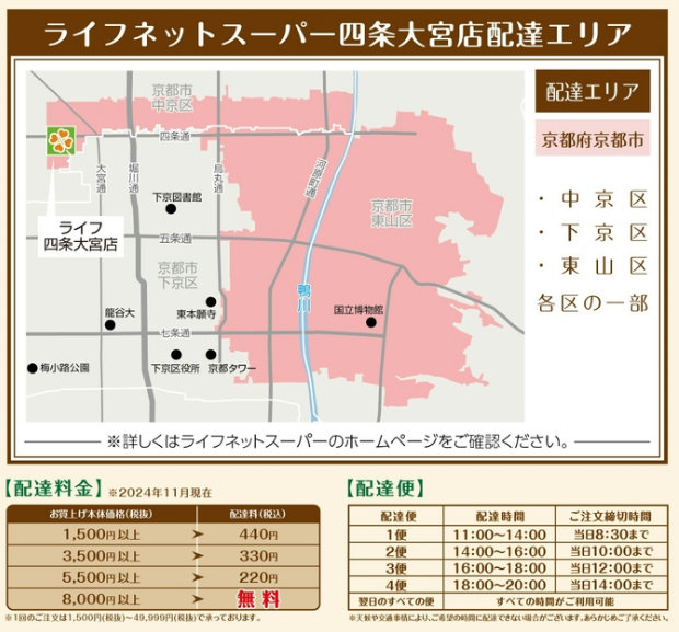 配送エリアは京都府京都市中京区・下京区・東山区の一部。