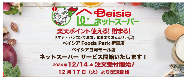 (株)ベイシア(群馬県前橋市、相木孝仁社長)は、楽天グループ(株)のプラットフォーム「楽天全国スーパー」内に出店する「ベイシアネットスーパー」で、ベイシアFoods Park新里店・ベイシア白河モール店からの配送を12月17日(火)から開始する。
