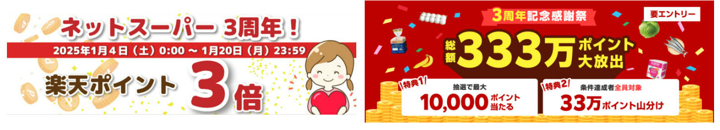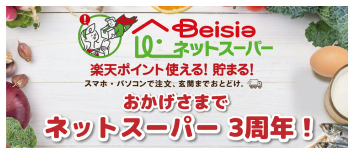 (株)ベイシア(群馬県前橋市、相木孝仁社長)は、楽天グループ(株)のプラットフォーム「楽天全国スーパー」内に出店する「ベイシアネットスーパー」の3周年を記念して、期間限定でお得なキャンペーンを開催する。
