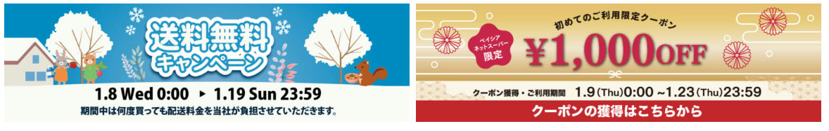 ほかにも1月8日(水)から1月19日(日)の期間は送料無料キャンペーンを、さらに「ベイシアネットスーパー」で初めて買い物をした顧客限定で、1月9日(木)から1月23日(木)まで、1000円OFFクーポンをプレゼントする。