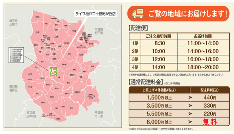 配送エリアは千葉県松戸市・市川市の一部。