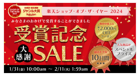 また「楽天ショップ・オブ・ザ・イヤー2024」の受賞を記念し、ベイシア楽天市場店で「楽天ショップ・オブ・ザ・イヤー2024 受賞記念SALE」を、1月31日(金)~2月11日(火)の期間開催する。