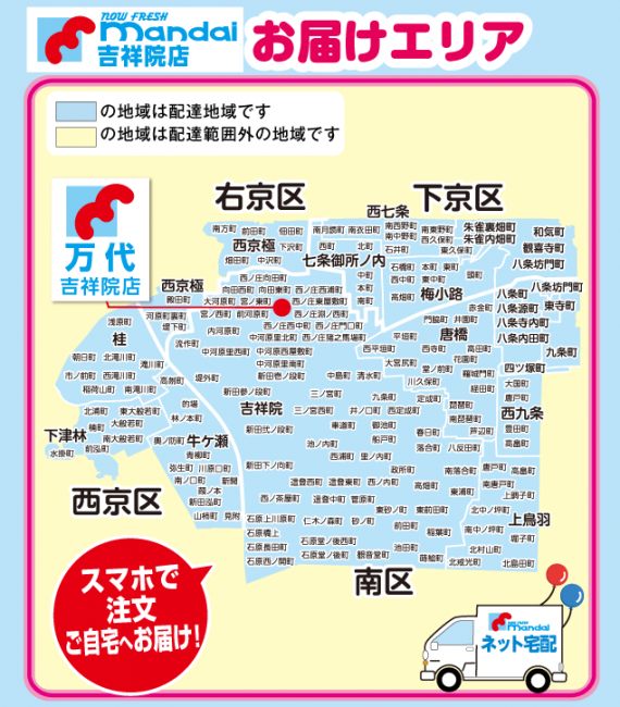 「吉祥院店」では、京都市の南区を中心に、右京区、下京区、西京区の一部エリアに配送する。