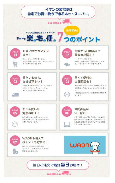 イオン北海道は、2008年12月にネットスーパーのサービスを開始して以来、即日配送や取り扱い品目の拡大を実施し、現在は道内21拠点から、離島を除く北海道内全ての世帯に配送できる体制を整備している。