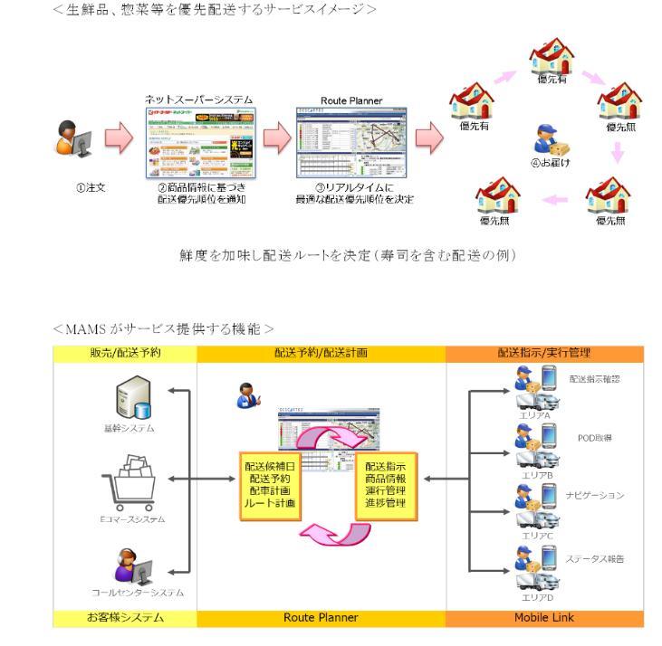 MAMSは注文時に配送計画を自動的に作成するクラウドサービスで、配送予定時間や配送状況等をウェブサイトで追跡・確認することができる。配送の際のルートについては、従来、配送担当者が独自に決定していたが、MAMSの導入により、配送ルートの自動化・効率化が可能となる。またPCやスマートフォンを使って情報を共有できる運営上のメリットに加え、生鮮品や惣菜を含む注文を優先的に配送するように設定できるため、できたての商品をより効率よくお客に届けるサービスの向上が図れる。