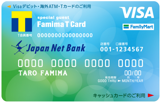 このカードは、ファミリーマートが発行するTカード「ファミマTカード」と(株)ジャパンネット銀行の「Visaデビット付キャッシュカード」の機能を一体化したもの。(株)Tポイント・ジャパンが提供する共通ポイントサービス「Tポイント」も利用できる。