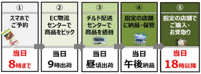 お客はスマートフォンの専用アプリを利用して朝8時までに商品を予約し18時以降に、店舗で購入する。注文は1回当たり1000円(税込)以上という利用条件がある。