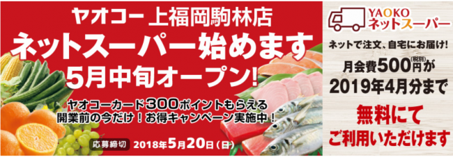 キャンペーン特典は、第1にネットスーパー開業前の5月20日までに申し込み会員になれば、買物をしたお客を対象にヤオコーカード300ポイントを付与する。第2は月会費500円(税別)を2019年4月まで1年間無料にする。