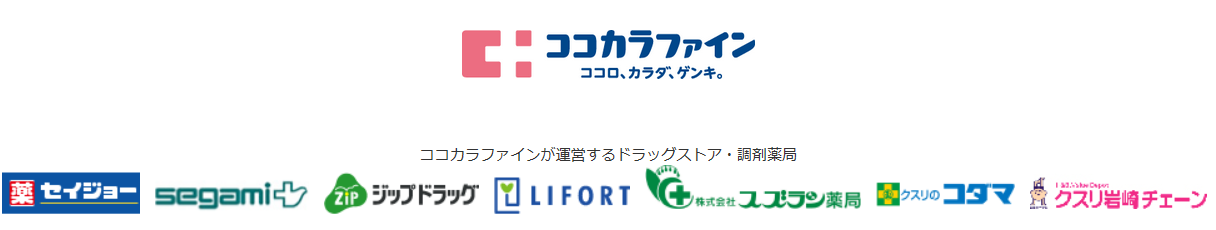 ココカラファインは2013年4月に(株)セイジョー、セガミメディクス(株)、(株)ジップドラッグ、(株)ライフォート、(株)スズラン薬局、(有)メディカルインデックスの6社が合併して誕生し、2013年10月には、(株)コダマを合併している。ドラッグストア、調剤薬局、介護事業を展開する。