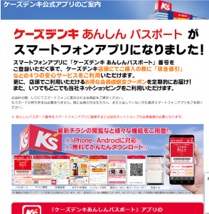 ケーズデンキグループは、「がんばらない(=無理をしない)」経営を標榜する。それに則って、「現金値引」、「長期無料保証」、「あんしんパスポート」などのサービスを提供する。あんしんパスポートアプリは、今年9月1日から、新規登録キャンペーンを実施した。アプリには、おすすめ商品の紹介やチラシの閲覧、顧客にお得なクーポンの配信などの機能がある。