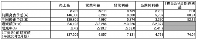 同社では第3四半期までの業績低迷を受け、通期目標の売上高を62億円減の1398億0500万円に、営業利益、経常利益、純利益についてもそれぞれ下方修正ている。