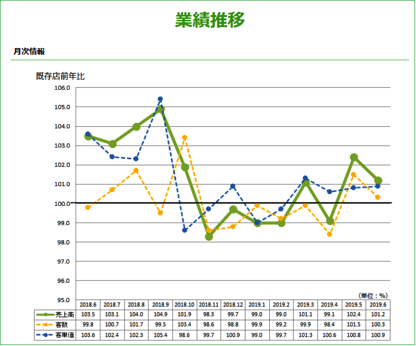 全店ベースでは、売上高は前年比2.4%増の570億6900万円。6月は新規出店はなかったので、店舗数は前月と変わらず272店舗だ。前年同月に比べると2店舗増加した。