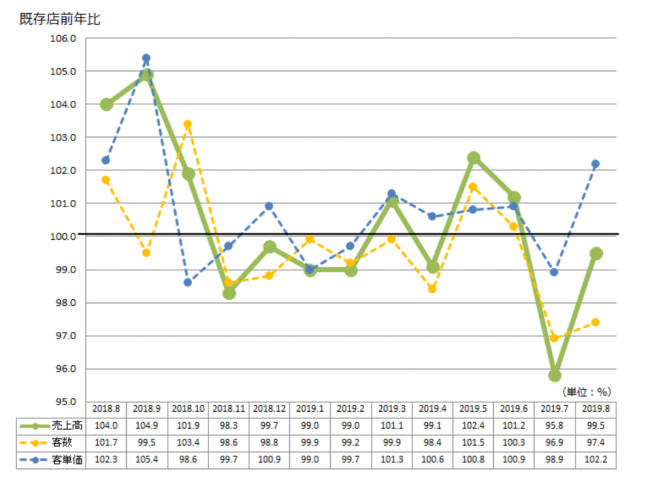 全店ベースでは、売上高は前年比0.8%増の578億1900万円。8月3日(土)に神奈川県川崎市に「川崎ルフロン店」を新規出店し、店舗数は274店舗となる。前年同月比で5店舗増えている。