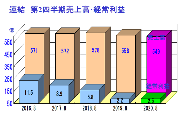 売上高は549億2300万円(前年同期比1.7%減)、営業利益は2億4400万円(20.7%増)、経常利益は2億5500万円(13.7%増)で、減収増益だった。ただし純利益は7200百万円(28.4%減)である。