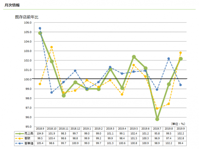 全店ベースでは、売上高は前年比4.2%増の593億5800万円。9月は4日(水)大阪市鶴見区に安田諸口店、11日(水)大阪府箕面市に箕面桜ケ丘店の2店舗を新規出店し、総店舗数は276店舗となる。前年同月比で7店舗増えている。